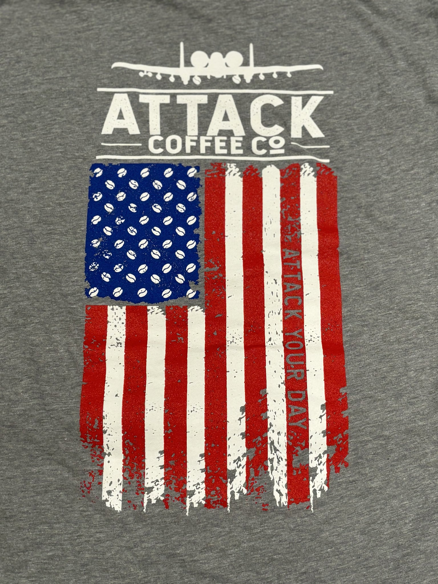 Courtesy of the Red, White and Blue! Attack Coffee short sleeve t-shirt with logo on the front left chest and the American flag on the back.